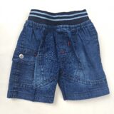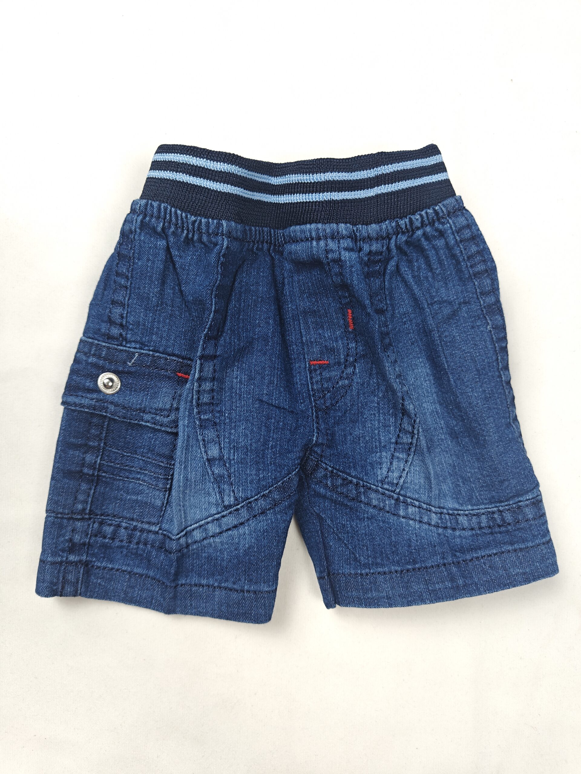 - Denim Shorts: Accompanied by dark wash denim shorts, designed with a comfortable elasticated waistband featuring a distinctive striped navy and light blue band.